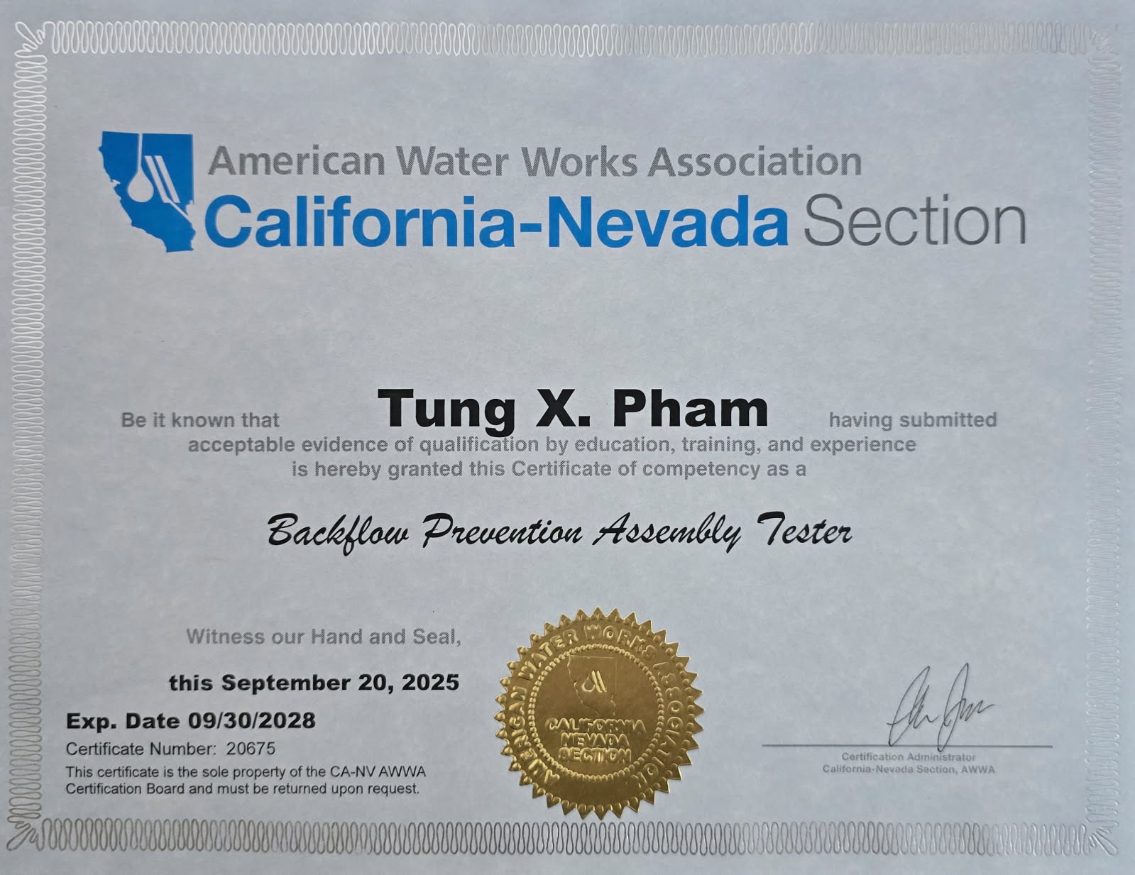 Backflow Prevention Services Pham’s Plumbing provides Backflow Testing, Installation and Repair. Certificate #20675